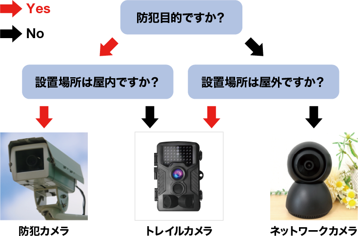 また、目的にあった防犯カメラを選びやすくなるようにYes / Noチャートを作ったので、利用してみて選ぶ際の1つの指標にしてみてください。